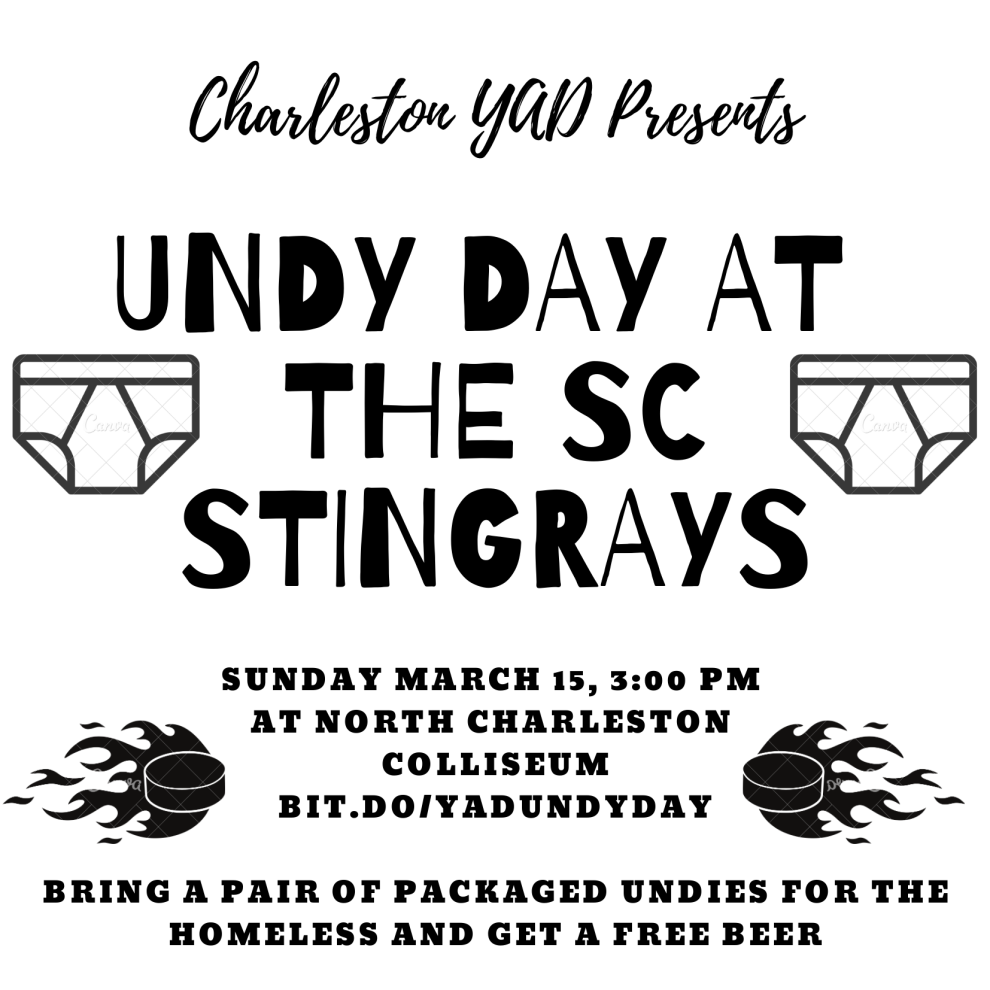 Fun day of Hockey with YAD for a cause! At Undie Sundays with the Stingrays fans are encouraged to bring new packaged underwear or socks to the game and throw them on the ice after the Rays score their first goal to benefit One80 Place, so come join your YAD friends for a good time and don't forget your underwear! If you bring packaged undies for the homeless, we will buy you a beer!