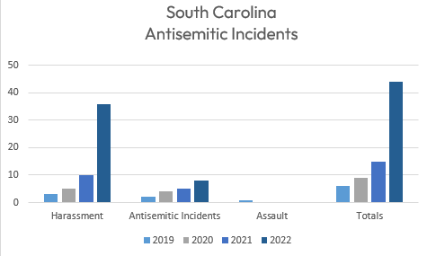 On Thursday, Match 23, the Anti-Defamation League released its 2022 Audit of Antisemitic Incidents. Across the US, incidents rose 36% from 2021 to 2022. In South Carolina, that rate was 193%. - 15 incidents in 2021 and 44 in 2022.