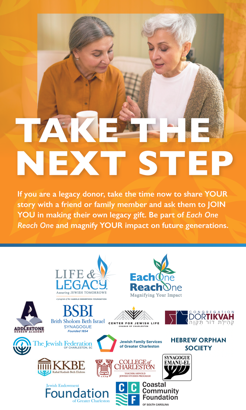 Through the new LIFE & LEGACY® Each One Reach One campaign, the Charleston Jewish community continues to partner with the Harold Grinspoon Foundation (HGF) to increase the number of donors participating in its community-wide endowment building legacy giving initiative. Â